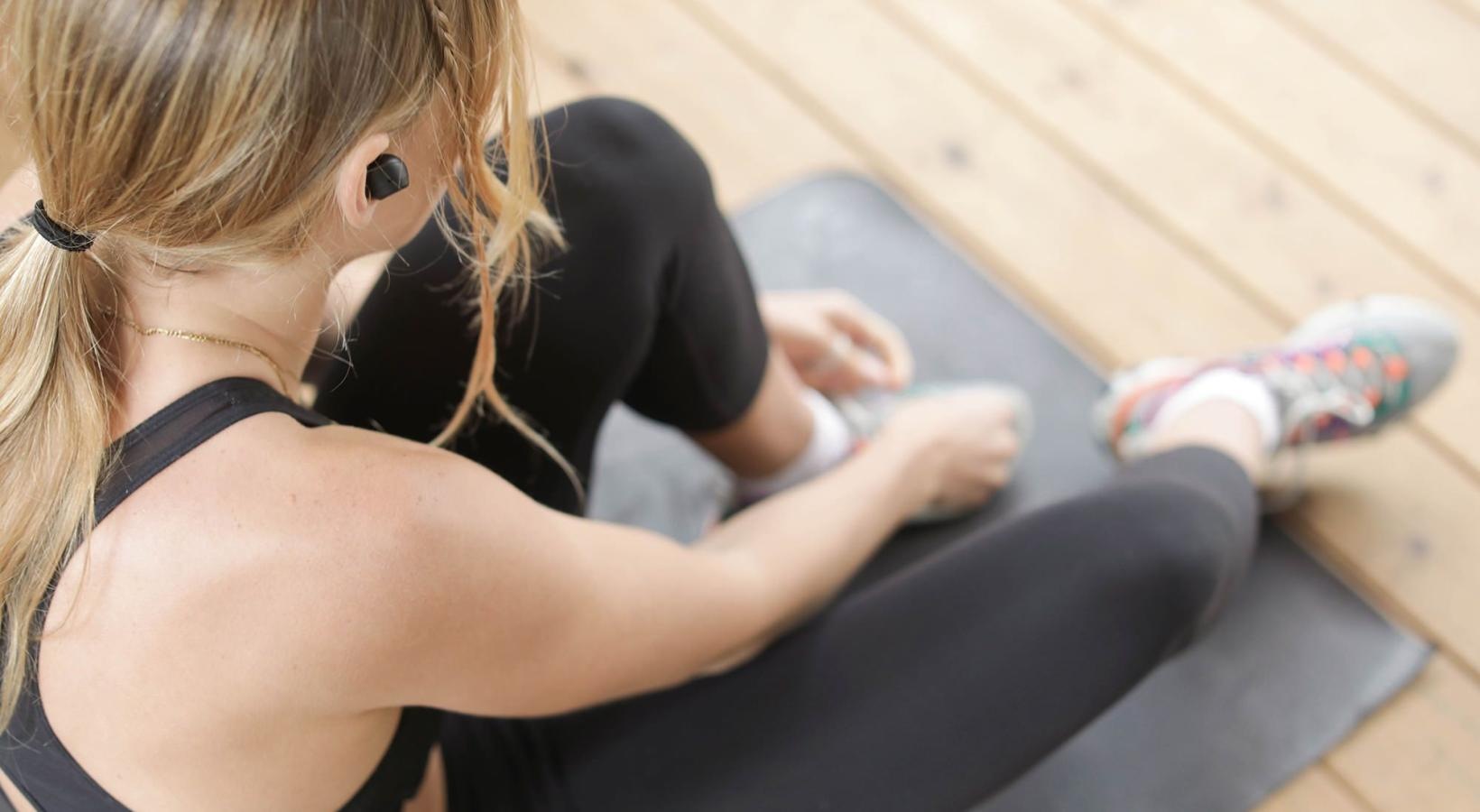 • woman in workout gear, sits on a yoga mat and ties her shoe